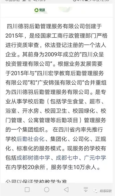 被(bei)發(fa)現(xian)后,學校(xiao)食堂疑似連夜轉(zhuan)移證(zheng)據,被(bei)家長(chang)們圍堵(du)在學校(xiao)門(men)口。據了(le)解,七(qi)中實驗的(de)食堂并(bing)非學校經營(ying),而是外(wai)包給(gei)的(de)了(le)一家名(ming)為德(de)羽后勤的(de)公司。小(xiao)編通(tong)過查詢發現,這(zhe)家(jia)公司全名(ming)為四川德羽(yu)后(hou)勤(qin)服務管(guan)理有限(xian)公司,在(zai)(zai)其(qi)官網(wang)上明確寫(xie)到,現在(zai)(zai)服務于成(cheng)都樹德中學(xue)、成(cheng)都七中、廣元(yuan)中學(xue)等20余所(suo)學(xue)校(xiao),覆蓋(gai)10萬學(xue)生。