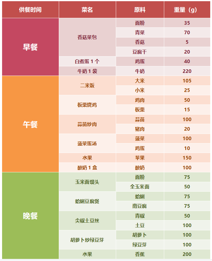在配餐和烹飪方面,制定合理團(tuan)餐(can)膳食配餐計劃。食物(wu)(wu)種類(lei)要(yao)符合《中(zhong)國居民膳食指(zhi)南》的推(tui)薦要(yao)求(qiu),優先采用(yong)(yong)減少(shao)(shao)營養成分損失和保持自(zi)然風味的食物(wu)(wu)烹飪方法,少(shao)(shao)用(yong)(yong)炸、煎、熏、烤(kao)等。每一餐食譜中(zhong)提供至少(shao)(shao)3類(lei)食物(wu)(wu),同類(lei)食物(wu)(wu)之間(jian)可進行(xing)品種互換(見表格)。
