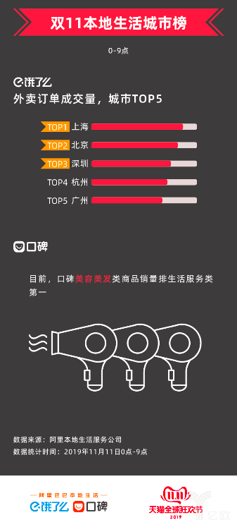 截(jie)至11日上(shang)(shang)午9:00,星(xing)巴(ba)克在餓了么雙11“飯票(piao)”榜上(shang)(shang)排名第一(yi),上(shang)(shang)海、北京、深圳、杭州、廣州位居餓了么外賣訂(ding)單量前五名。口碑APP上(shang)(shang),美容美發(fa)類商(shang)品銷量在生(sheng)活服務類中(zhong)位居前列(lie)。