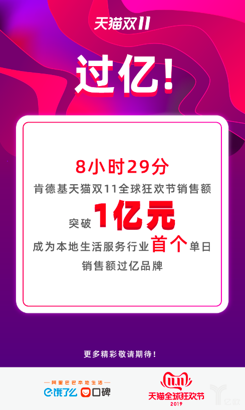 2019年11月11日(ri),口碑餓了么透露(lu),當日(ri)上午8:29分,肯(ken)德(de)基在(zai)2019天貓雙11全(quan)球狂歡節上的銷(xiao)(xiao)售額正式突破1億元。這是我(wo)國(guo)本(ben)地生活行(xing)業首個單日(ri)銷(xiao)(xiao)售額過億的品牌。