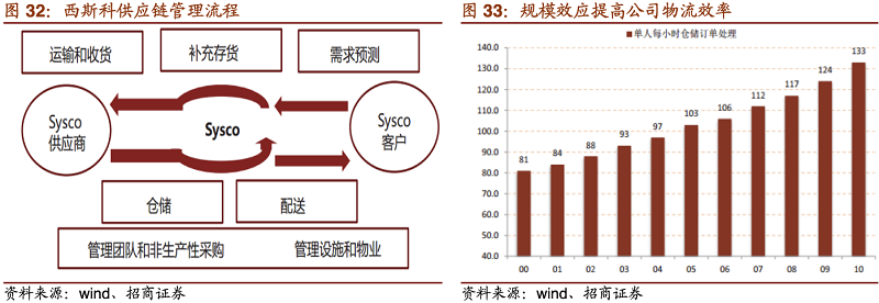 其(qi)四,SYSCO有強(qiang)大的(de)供應鏈管理能(neng)力,保證物流效率(lv)(lv)。配送中心數量多(duo),通(tong)過規模效應降低了人(ren)力和物流成本,基本上是用ERP系(xi)統開展業(ye)務。產品十分豐富,可(ke)做到(dao)(dao)一站式(shi)服務,同(tong)時涉獵食品和非食品,公司通(tong)過專(zhuan)業(ye)營銷(xiao)與執行(xing),提升對客戶的(de)滲透(tou)率(lv)(lv)與服務黏(nian)性。SYSCO銷(xiao)售的(de)毛利率(lv)(lv)基本上做到(dao)(dao)了18.7%,銷(xiao)售凈(jing)利潤率(lv)(lv)做到(dao)(dao)了百分之二點多(duo)。