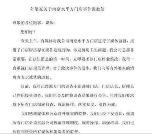 對于上述視頻中(zhong)外婆家(jia)存在的問(wen)題,3月15日中(zhong)午,公司創始人吳國(guo)平(ping)做(zuo)出回應:發布致歉信稱向廣大消(xiao)費者致歉,對門(men)店進(jin)(jin)行整(zheng)改(gai)并(bing)(bing)處罰相關責任人,并(bing)(bing)表示將(jiang)會對涉事門(men)店進(jin)(jin)行停業(ye)整(zheng)頓。